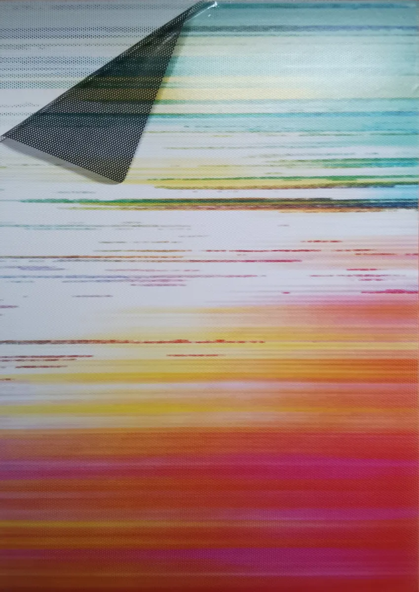 A bit of nostalgia: A 20-year-old design I did for an album (which was never used), combined with a re-worked layer of itself. UV-print on perforated advertisement film, partially pulled to reveal the carrier film, which is normally waste (but holds the rest of the ink). Recommended presentation is: object case, anti-reflexive glass, 99% UV protection, estimeated price: € 800,-
